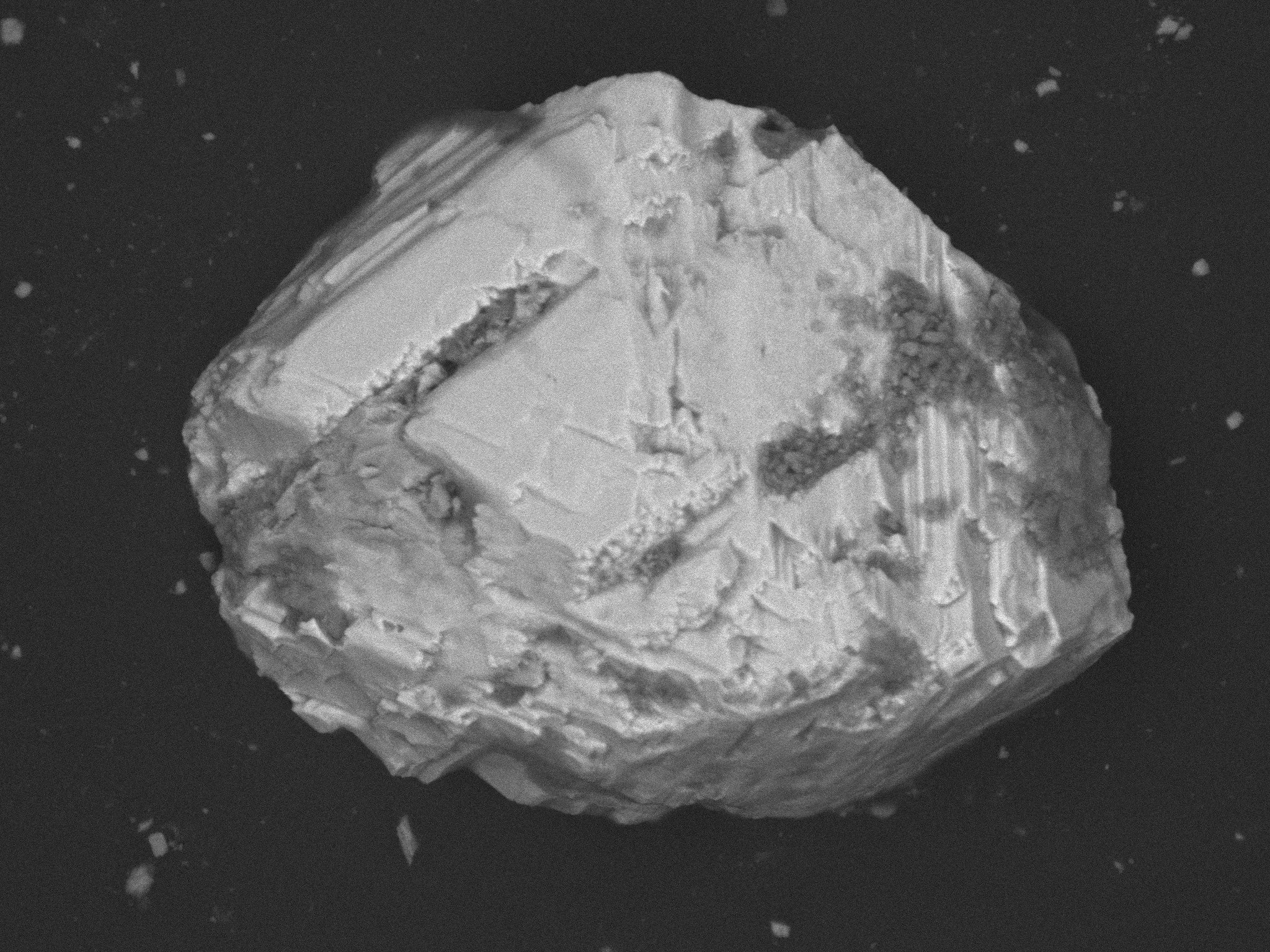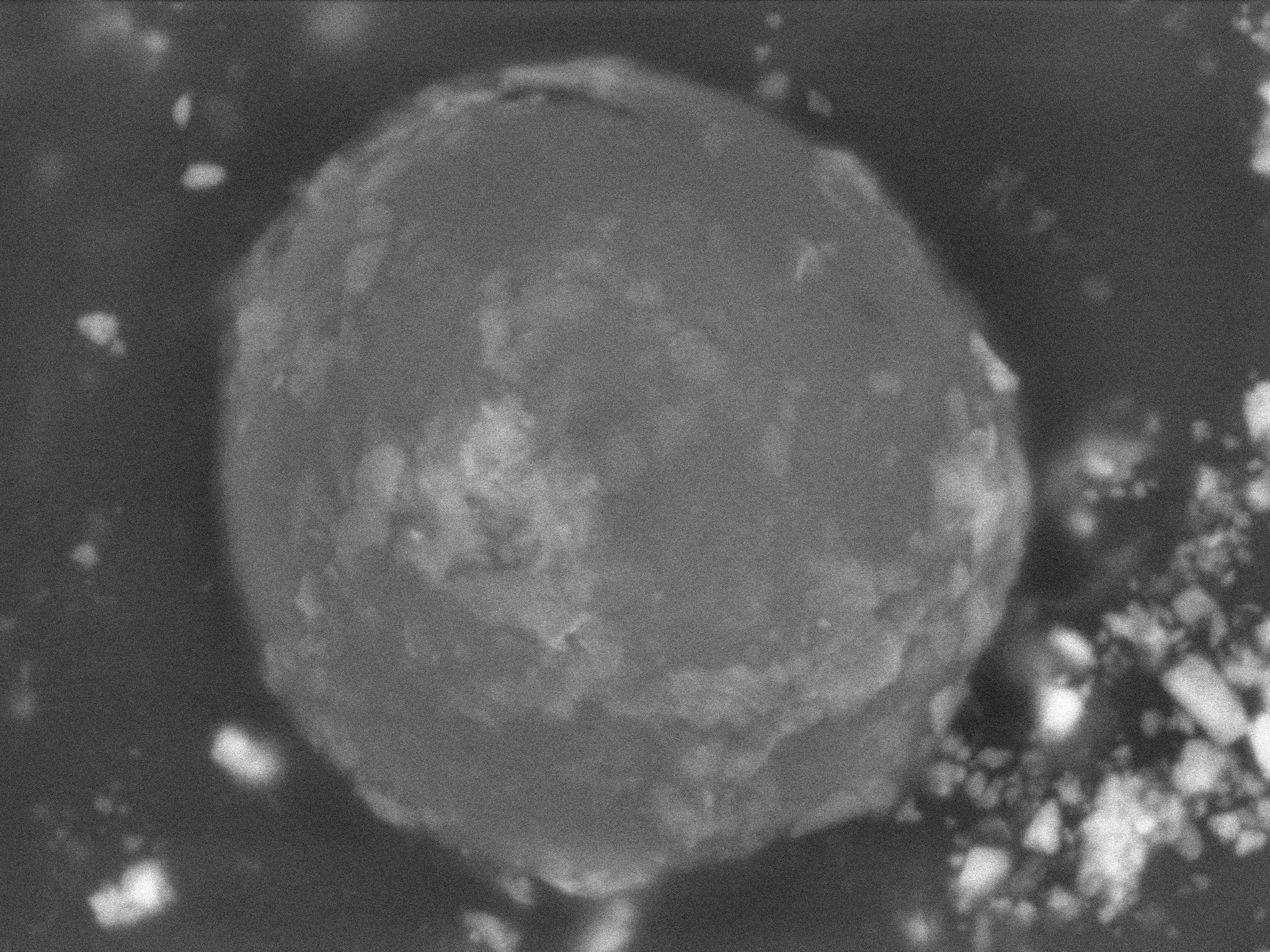 An SEM image of a “silibead” or industrial glass bead used in many processes such as water filtering and polishing/grinding. They can come in many different sizes and are characterised by their near homogenous composition and almost perfectly smooth surface. They also appear as translucent glass in optical light. The dendritic crystals on the surface are recrystallised salt and chalk grains from contamination. Image credit: Imperial College London Micrometeorite Group
